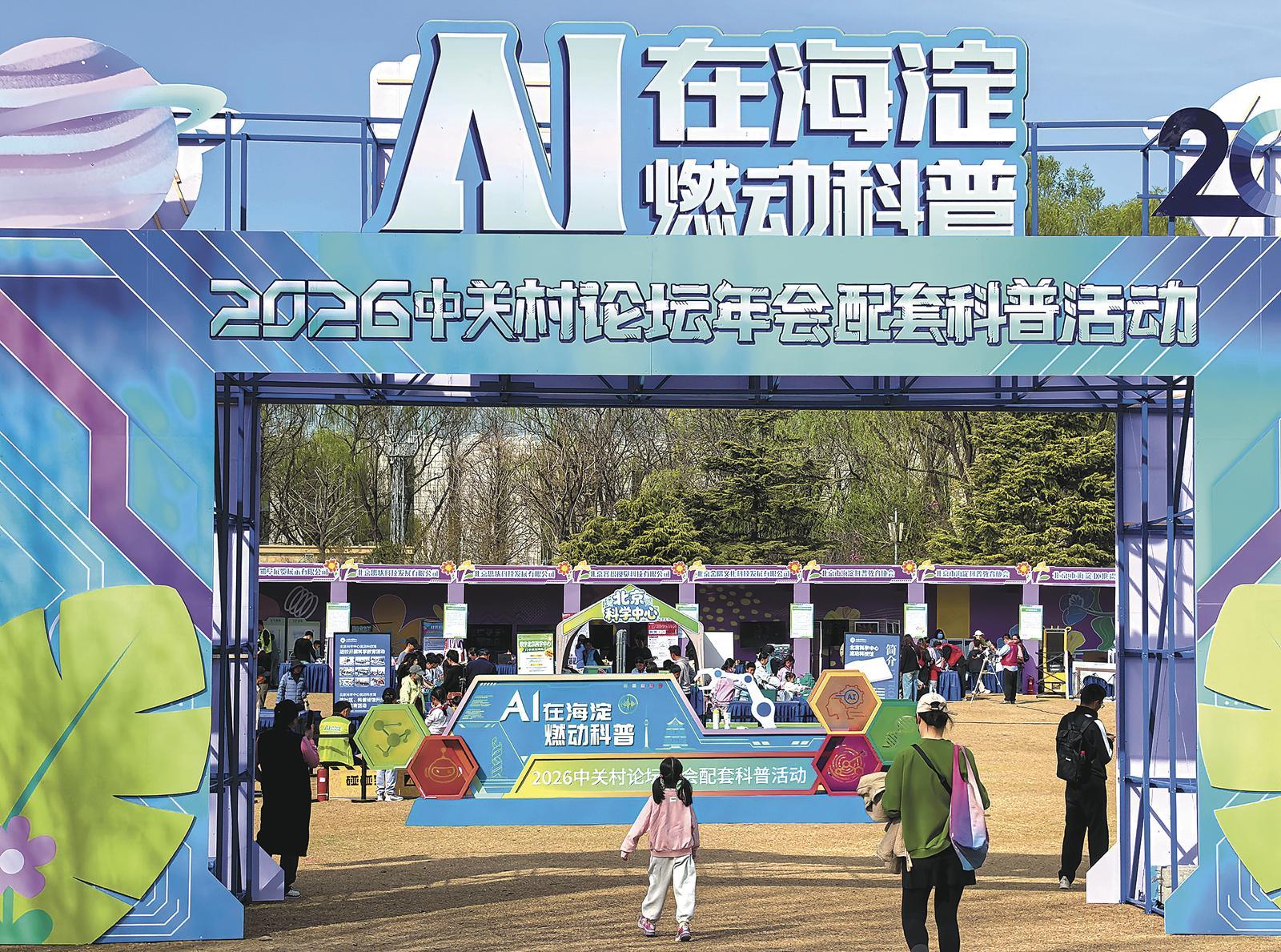 作为2026中关村论坛年会的配套科普活动,“AI在海淀 燃动科普”现场设置科技美食市集、智能采摘机器人演示、机甲巡游等多个互动区域,吸引众多市民前来参观体验。