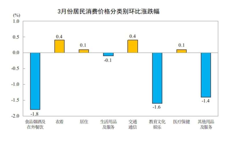 3月份,全国居民消费价格环比下降0.7%。其中,城市下降0.7%,农村下降0.5%;食品价格下降2.7%,非食品价格下降0.2%;消费品价格下降0.3%,服务价格下降1.1%。