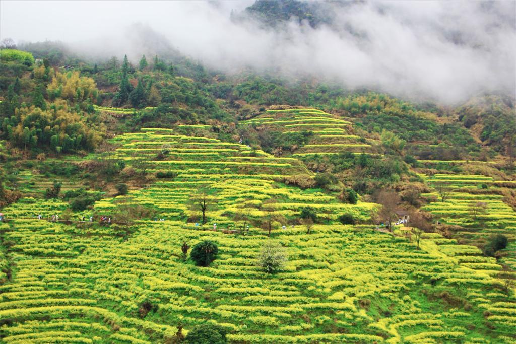 在江西婺源,13万亩油菜花次第绽放。金黄花海间,粉墙黛瓦的徽派古村错落有致,万亩梯田层叠起伏,油菜花与青山碧水相映成趣。广东游客黄婧身着传统服饰,置身花海间:“不是单纯看风景,更是感受到了江南乡村的烟火气。”