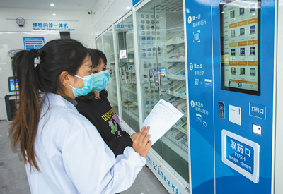 浙江省金华经济技术开发区苏孟乡和悦社区卫生服务智慧健康驿站,居民在医生指导下通过自助药柜取药。 |