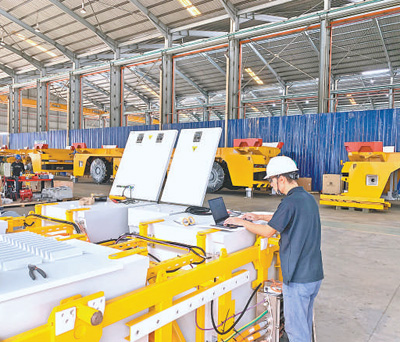 中国工程师正在检测和调试AGV动力电池系统。 |